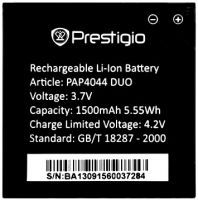 Prestigio (PAP4044DUO) 1500mAh Li-ion, оригінал 3.7V. Відповідність: Prestigio MultiPhone 4044 Duo. Розміри: 51 х 51 х 5мм. крайній (+) 4,5 мм.