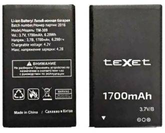 Оригінальна акумуляторна батарея TeXet (TM-301) 1700mAh Li-ion. Відповідність: TeXet TM-301, TM309. Гарантія 6 месяців, доставка по Україні, можлива доставка за кордон.